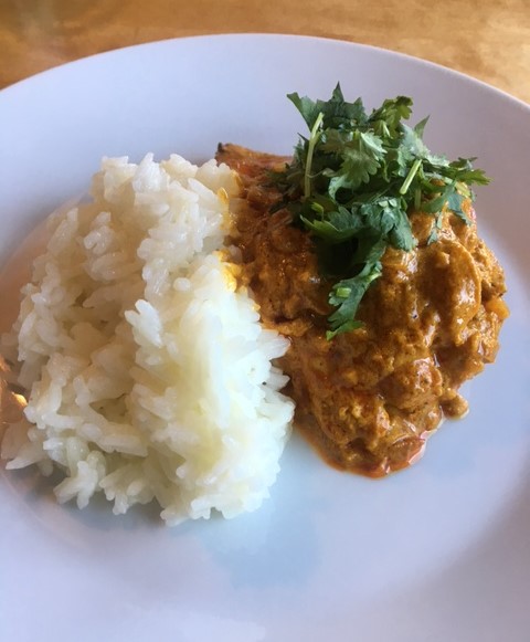 Börja med att dela kycklinglårfiléerna. Lägg över i en bunke. Blanda övriga ingredienser till marinaden i en annan bunke och häll sedan över kycklinglårfiléerna. Låt marinera mellan 6 – 12 timmar (ex över natten). Hetta upp en stekpanna på medelvärme och lägg i smör. Fräs lök, vitlök och ingefära i någon minut under omrörning. Tillsätt sedan spiskummin, garam masala, gurkmeja och tomatpurén. Fräs ytterligare någon minut. Lyft ut den marinerade kycklingen och stek tillsammans kryddorna. När kycklingen fått lite färg tillsätt överbliven marinad. Dra ned till medelvärme och låt ”grytan” småtputtra i ca 15 min eller tills kycklingen är klar. Toppa med hackad koriander. Servera med basmatiris smaksatt med kanelstång och kardemummakapslar och chapati eller naan-bröd.