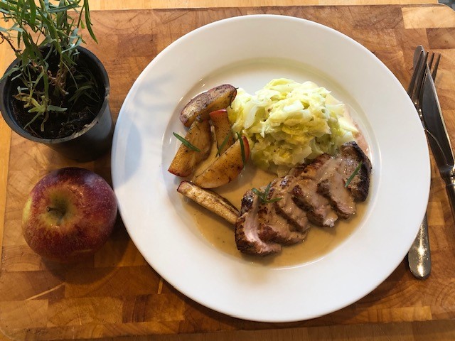 Sätt ugnen på 170 grader. Hetta sedan upp en stekpanna på hög värme. Tillsätt smöret. Lägg i köttbitarna när smöret ”tystnat”. Lägg även ned en kvist dragon och en hel vitlöksklyfta. Stek fläskfilén så att det får färg på båda sidorna och ös gärna med smöret i stekpannan. Krydda med den rostade vitpepparn och salt. Lägg ned äppelklyftor runt filen i stekpanna och låt även dessa få lite färg. Lägg över köttet och äpplen i en ugnssäker form. Stek köttet till ca 69-70 grader (använd en stektermometer). Ta ut ugnsformen och låt köttet vila i ca 10 minuter innan du skär upp dem.