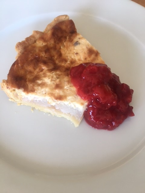 Färskostpaj med inkokta päron, nötter och citrus med en plommon och persikomarmelad
