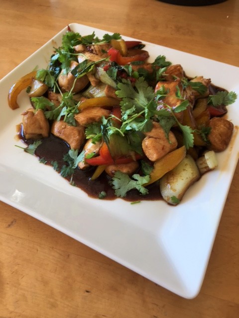 Lägg upp och toppa med cashewnötter och koriander. Servera med jasminris.