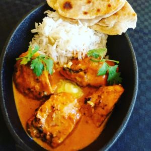 Just nu tveklöst min favorit när det gäller indisk mat. Marinerade och kolgrillade kycklinglårfiléer i en makhani sås, rostade cashewnötter, basmatiris och chapatibröd. Får du inte tag på kashmiri chilipulver (ett väldigt rött chilipulver) kan du ersätta med 3/4 paprikapulver och 1/4 cayennepeppar.