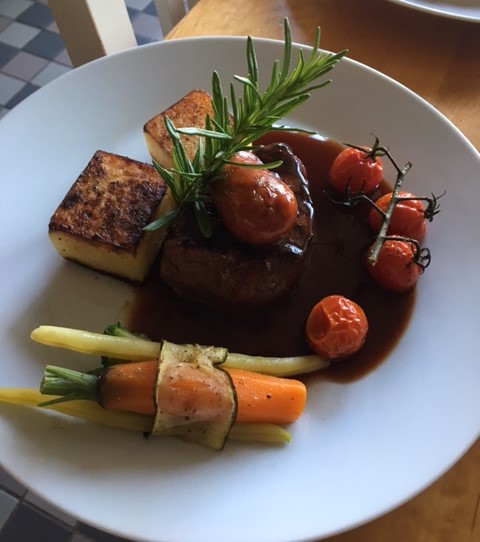 Värm såsen och grönsaksknytet snabb. Lägg upp den confiterade potatisen, köttet, tomaterna, grönsaksknytet och häll över varm sås. Toppa med korven. Garnera med rosmarin eller timjan.