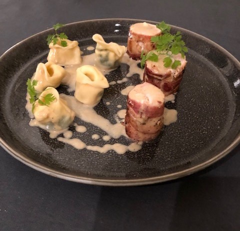 Tortelleni med ricotta och spenat, kycklingballotine med gorgonzola och pancetta samt sherryvinägersås